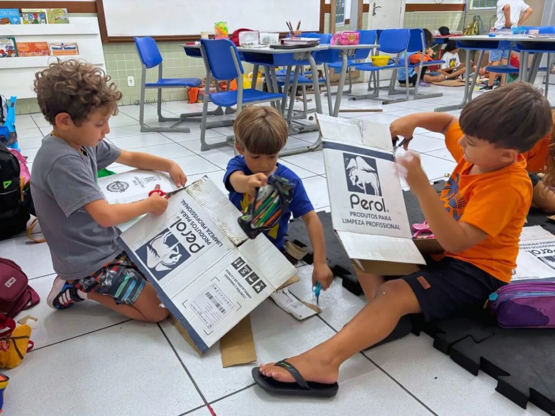 Outro destaque da rotina do Período Integral é o trabalho com a cultura maker e a sustentabilidade. Na Oficina de Invenções, as crianças transformam materiais recicláveis em brinquedos tradicionais, como petecas, bonecas de pano, pés de lata e vai-e-vem.