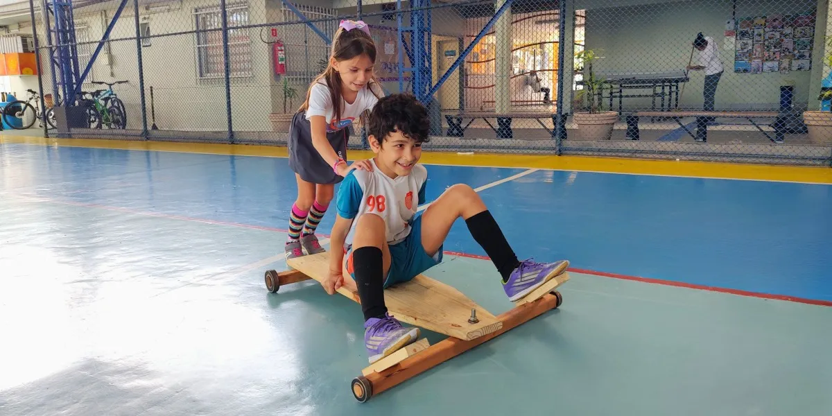 Além da construção, cada aluno registra suas ideias e planeja as etapas de produção do brinquedo, exercitando organização, autonomia e imaginação. Na Oficina de Criação, os alunos são convidados a inventar ou reinventar jogos em grupo. Eles escolhem nomes, definem regras, testam as brincadeiras e fazem ajustes coletivos.