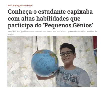 Matéria publicada no site da CBN Vitória, de 12 julho de 2022. O conteúdo publicado, explica a trajetória do aluno do 7º ano da Escola Monteiro, Igor Pinheiro dos Santos Miranda, 12 anos, único capixaba selecionado pra participar de mais uma edição do quadro “Pequenos Gênios”, do “Domingão com Huck” (TV Globo).