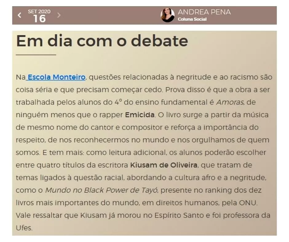 Nota publicada na Coluna Social Andrea Pena, do jornal Folha Vitória, no dia 16 de setembro de 2020.